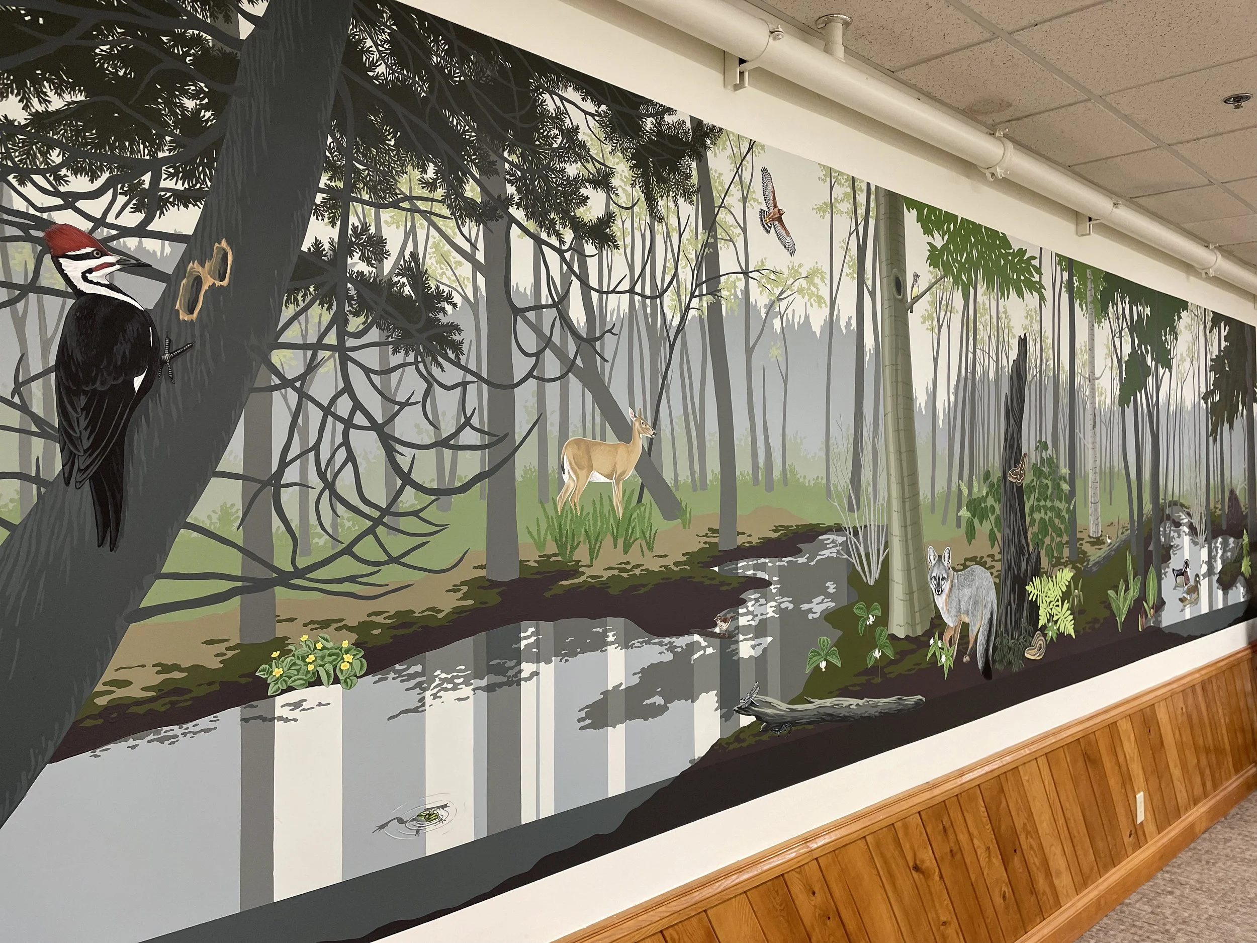The Ridges & Swales mural (2021) is located inside the Family Activity Room at Woodland Dunes Nature Center & Preserve in Two Rivers, Wisconsin. Woodland Dunes preserves an ecologically significant ridge and swale system, shaped over time by the changing shoreline of Lake Michigan. The alternating ridges and swales create a mosaic of habitats that are beautiful and fascinating.